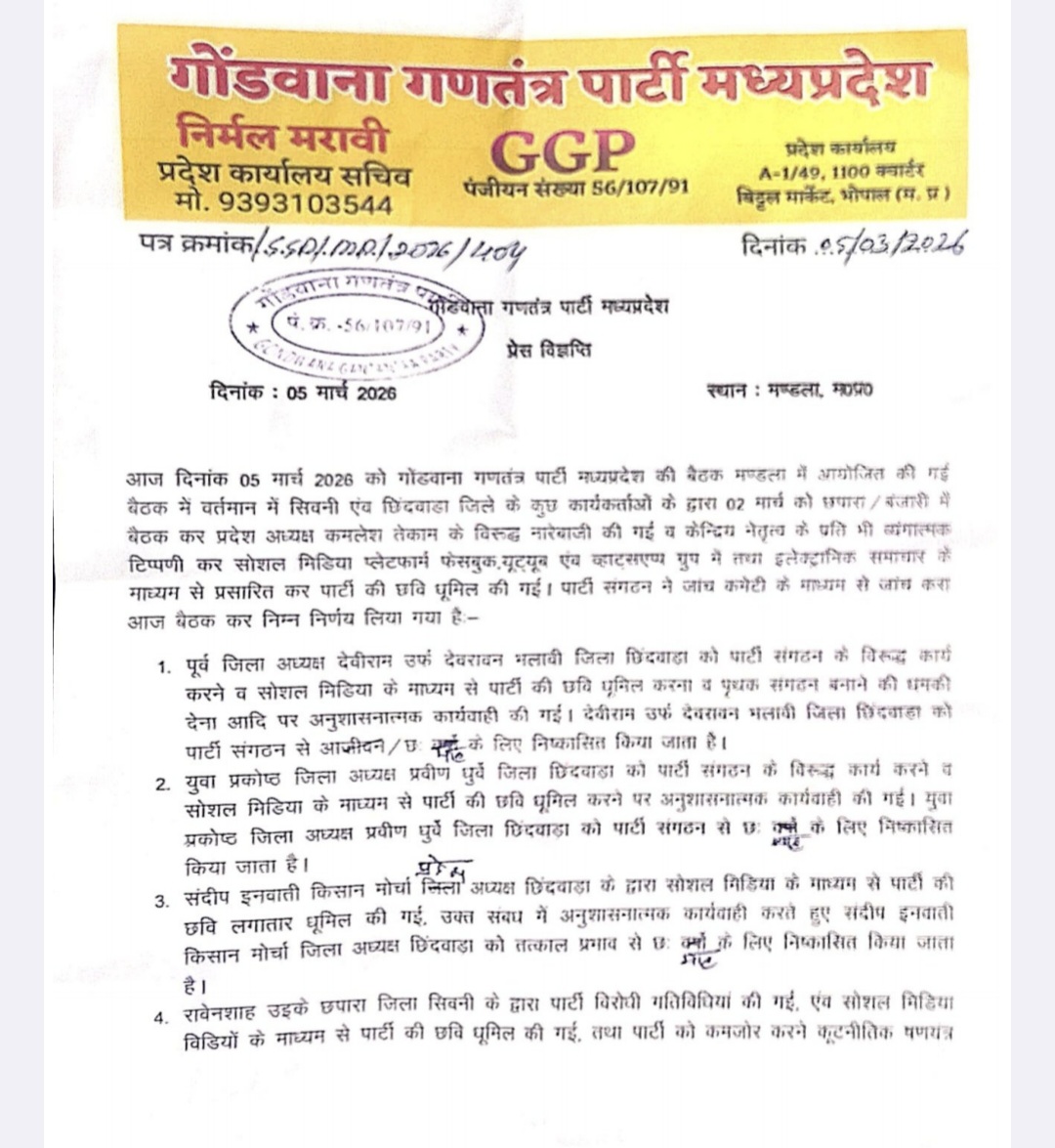 गोंडवाना गणतंत्र पार्टी की बड़ी कार्रवाई: अनुशासनहीनता पर पूर्व जिलाध्यक्ष सहित 4 नेता निष्कासित, पूर्व विधायक को नोटिस