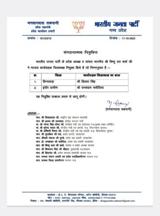 विधान सभा चुनाव को लेकर प्रदेश बीजेपी ने छिंदवाड़ा और इंदौर में जिला संगठन में नियुक्ति की है। इनमे छिंदवाड़ा जिले में प्रियवर सिंह को कार्यवाहक जिला अध्यक्ष और इंदौर ग्रामीण से घनश्याम सिंह नौरलिया को कार्यवाहक अध्यक्ष नियुक्त किया है।