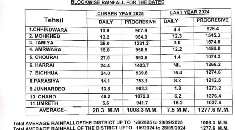 1 जून से 28 सितम्बर 2025 तक जिले में औसतन 1008.3 मिमी बारिश दर्ज की गई है। यह सामान्य औसत वर्षा 1059.0 मिमी से करीब 51 मिमी कम है। वहीं पिछले वर्ष इसी अवधि में औसतन 1277.6 मिमी बारिश हुई थी, जो इस साल से करीब 269 मिमी अधिक थी।