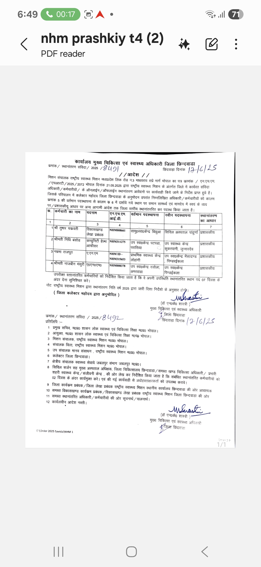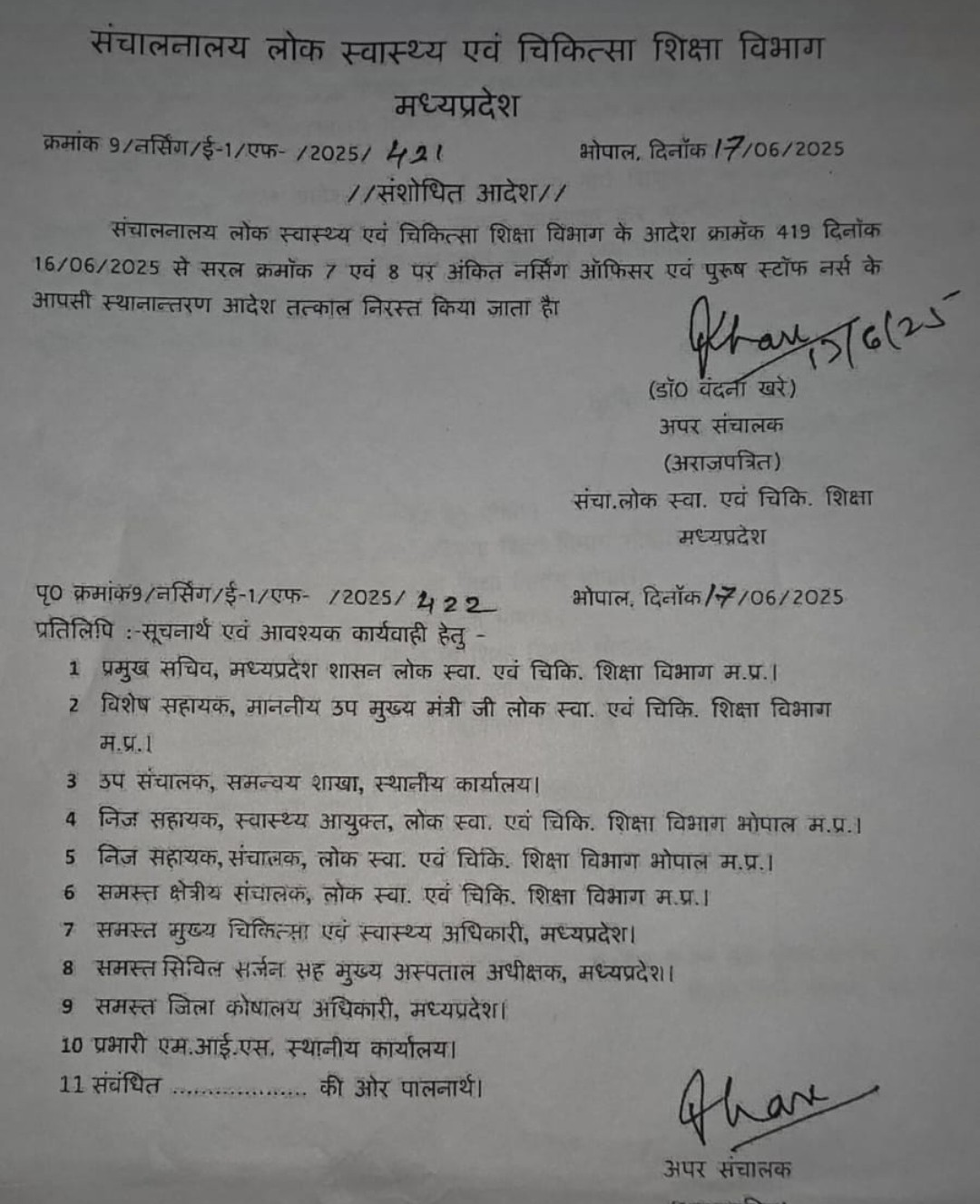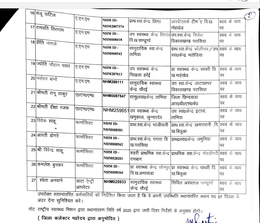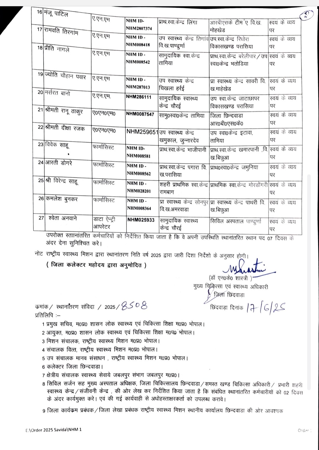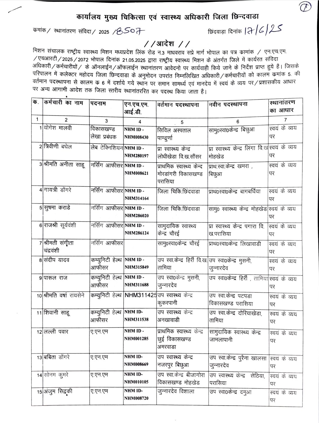 मुख्य चिकित्सा एवं स्वास्थ्य अधिकारी कार्यालय छिंदवाड़ा द्वारा 17 जून 2025 को जारी आदेश में बताया गया है कि ऑनलाईन और ऑफलाइन आवेदन के आधार पर इन स्थानांतरणों को कलेक्टर महोदय के अनुमोदन के उपरांत स्वीकृति प्रदान की गई है।