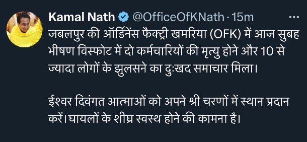 ख़बर अपडेट प्राप्त जानकारी अनुसार इस घटना में दो लोगों की जान चली गई जिस पर पूर्व मुख्यमंत्री कमलनाथ ने दुख व्यक्त करते हुए सोशल मिडिया x पर एक पोस्ट किया है