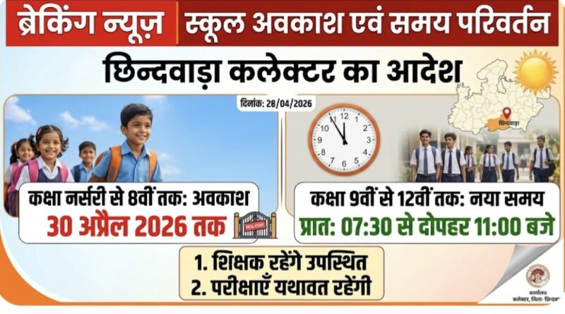 कलेक्टर द्वारा जारी आदेश के अनुसार, जिले के समस्त शासकीय, अशासकीय, सीबीएसई (CBSE) और आईसीएसई (ICSE) स्कूलों में नर्सरी से कक्षा 8वीं तक के विद्यार्थियों के लिए 30 अप्रैल 2026 तक अवकाश घोषित किया गया है।