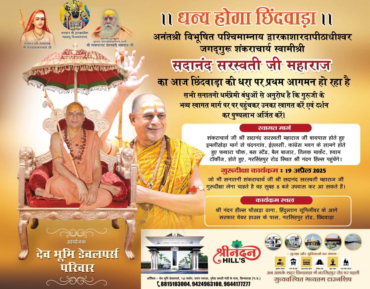 छिंदवाड़ावासियों के लिए यह गौरव का क्षण है कि द्वारका शारदा पीठ के पीठाधीश्वर, अनंत श्री विभूषित जगद्गुरु शंकराचार्य स्वामी श्री सदानंद सरस्वती जी महाराज का प्रथम आगमन नगर में होने जा रहा है। यह ऐतिहासिक अवसर 17 से 19 अप्रैल तक श्री नंदन हिल्स, चौखड़ाढाना में आयोजित तीन दिवसीय प्राण-प्रतिष्ठा एवं मंदिर लोकार्पण समारोह के रूप में मनाया जाएगा।