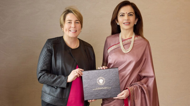 संस्थापक अध्यक्ष श्रीमती नीता अंबानी को मैसाचुसेट्स की गवर्नर माननीय मौरा हीली द्वारा प्रतिष्ठित गवर्नर प्रशस्ति पत्र से सम्मानित किया गया, जिसमें उन्हें एक दूरदर्शी नेता, दयालु परोपकारी और सच्चे वैश्विक परिवर्तनकर्ता के रूप में मान्यता दी गई। यह प्रशस्ति पत्र श्रीमती अंबानी के शिक्षा, स्वास्थ्य सेवा, खेल, कला, संस्कृति और महिला सशक्तिकरण में परिवर्तनकारी प्रभाव के लिए आजीवन समर्पण का सम्मान करता है – जिसने भारत और उसके बाहर लाखों लोगों के जीवन को प्रभावित किया है।